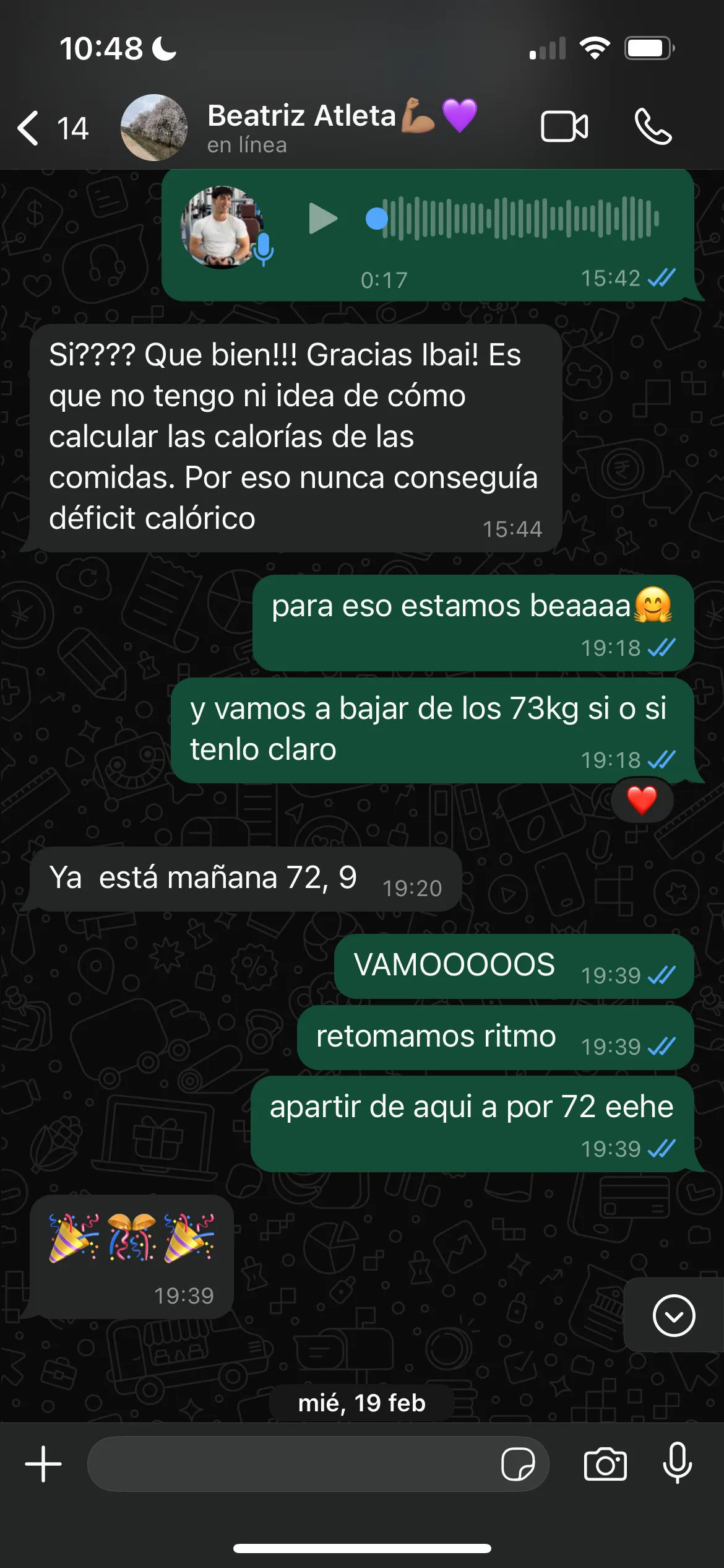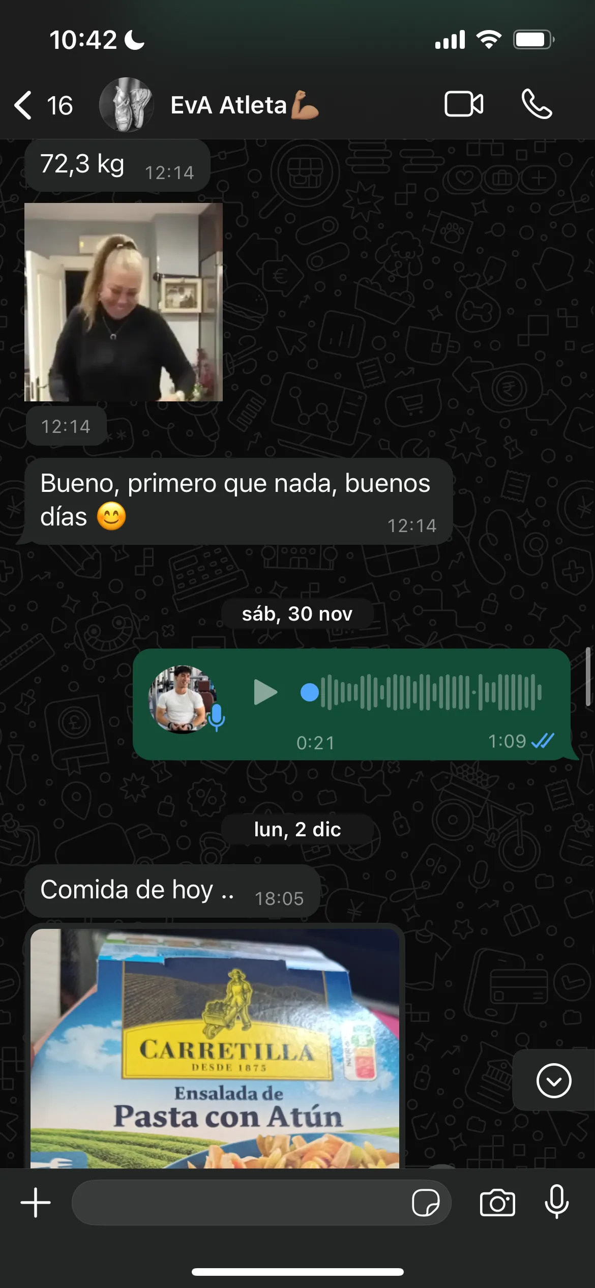 Madre de familia, con 0 tiempo, mucho trabajo, un hijo al que cuidar y una ansiedad y atracones por la comida que tratar. Paty llego a mi con una muy mala relación con la comida, principalmente por que no sabía que, cuando, como comer… Picaba lo primero que veia en la nevera y cada día subía más de peso